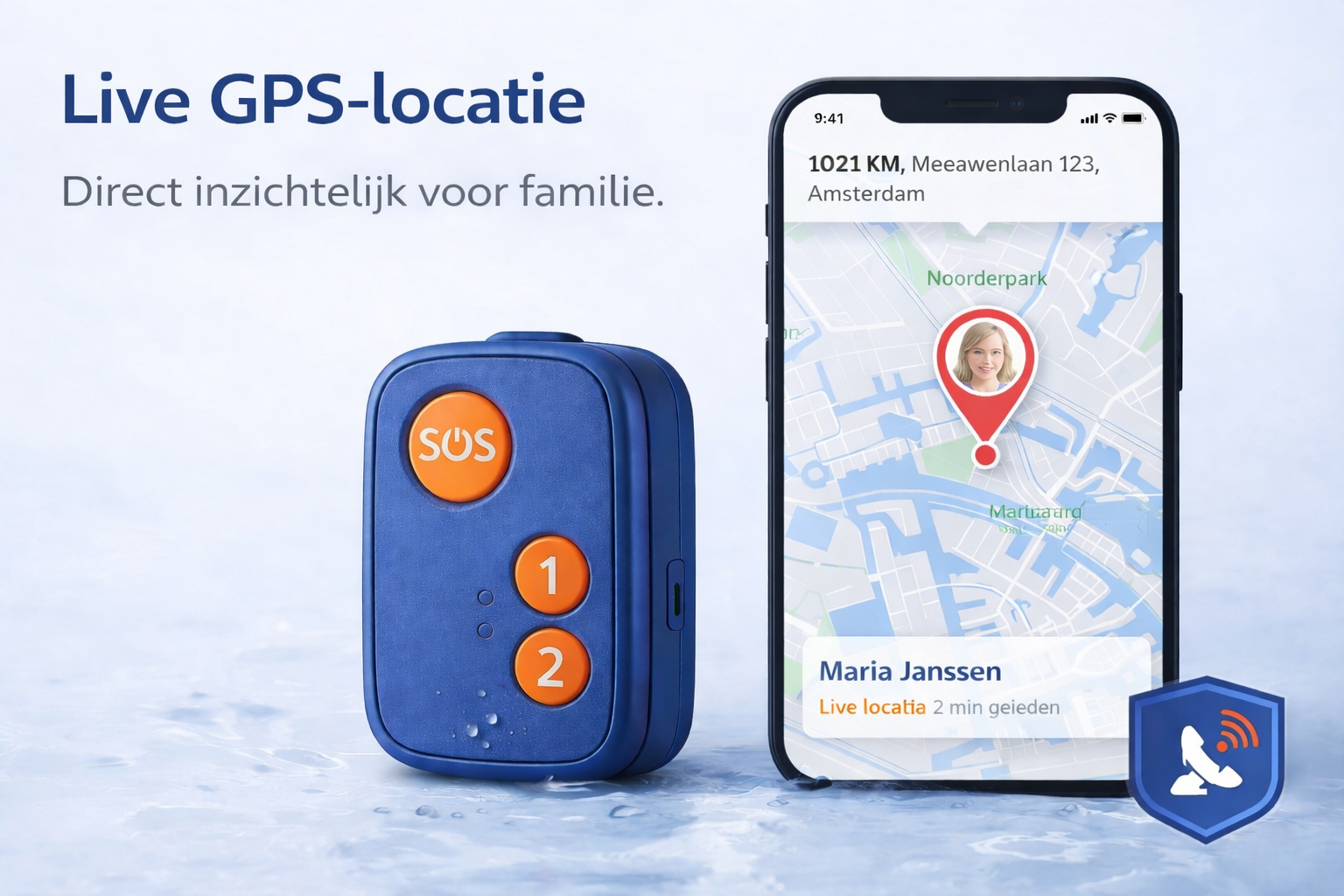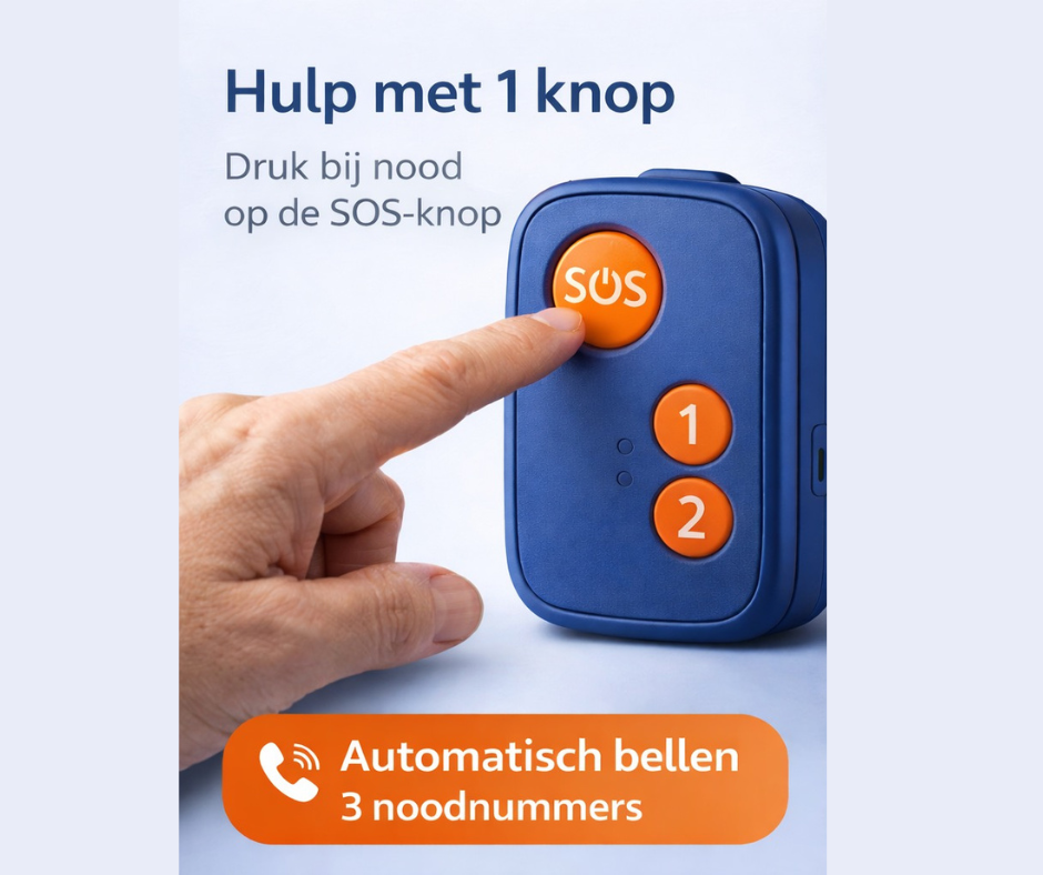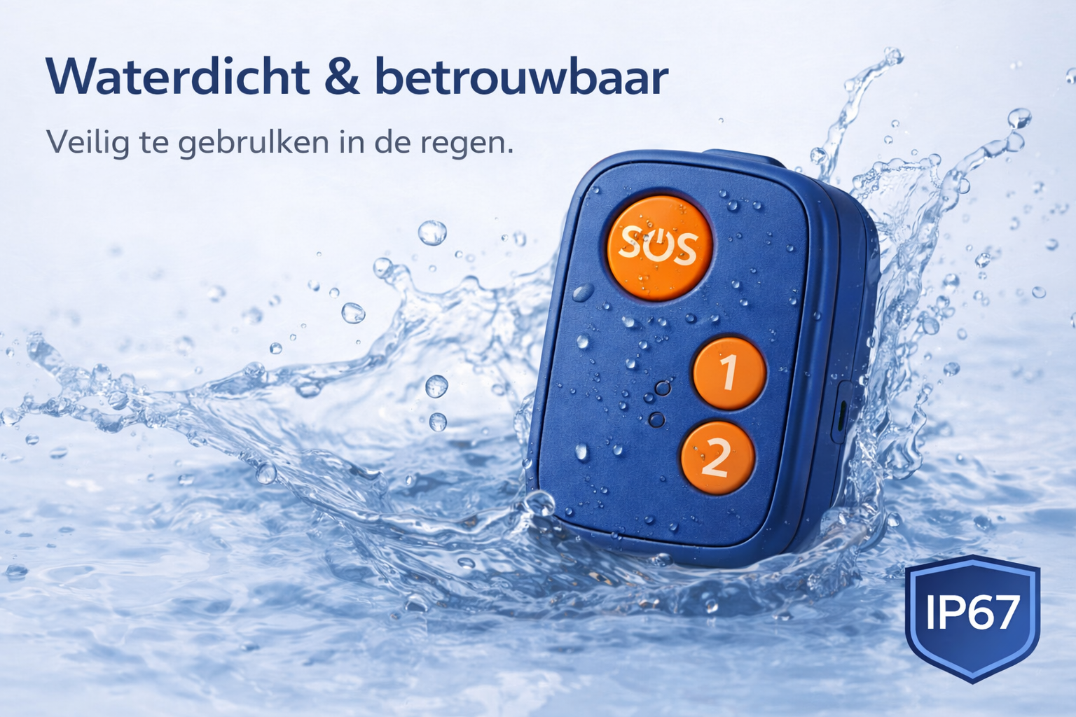 Dit waterdichte PersonalClick Alarmknop is het ideale hulpmiddel voor senioren die langer veilig thuis willen blijven wonen. De alarmknop is voorzien van één knop met SOS functie, waarmee u eenvoudig mantelzorgers, familie of noodnummers kunt bellen in geval van nood zonder onnodige functies. U kunt tot drie noodnummers instellen. Dankzij de bijgeleverde app en GPS kunnen uw naasten altijd zien waar u zich bevindt, tenzij u deze functie uitschakelt. Neemt het eerste nummer niet op? Dan belt het automatisch naar het volgende nummer.